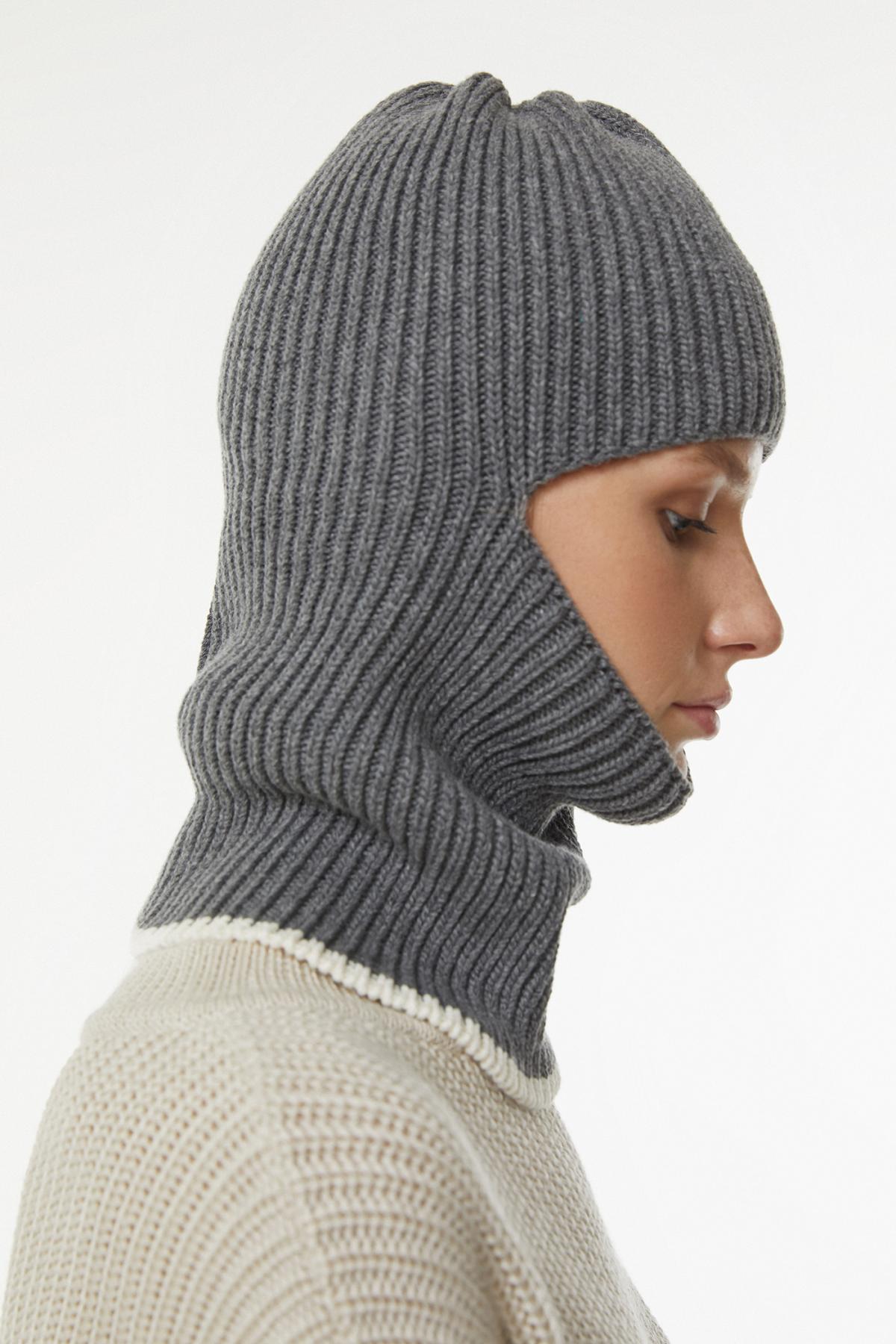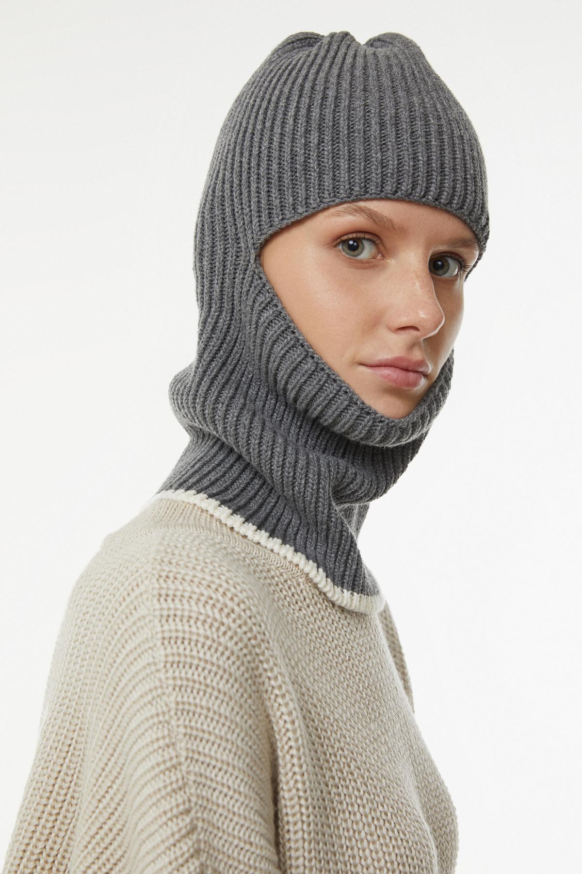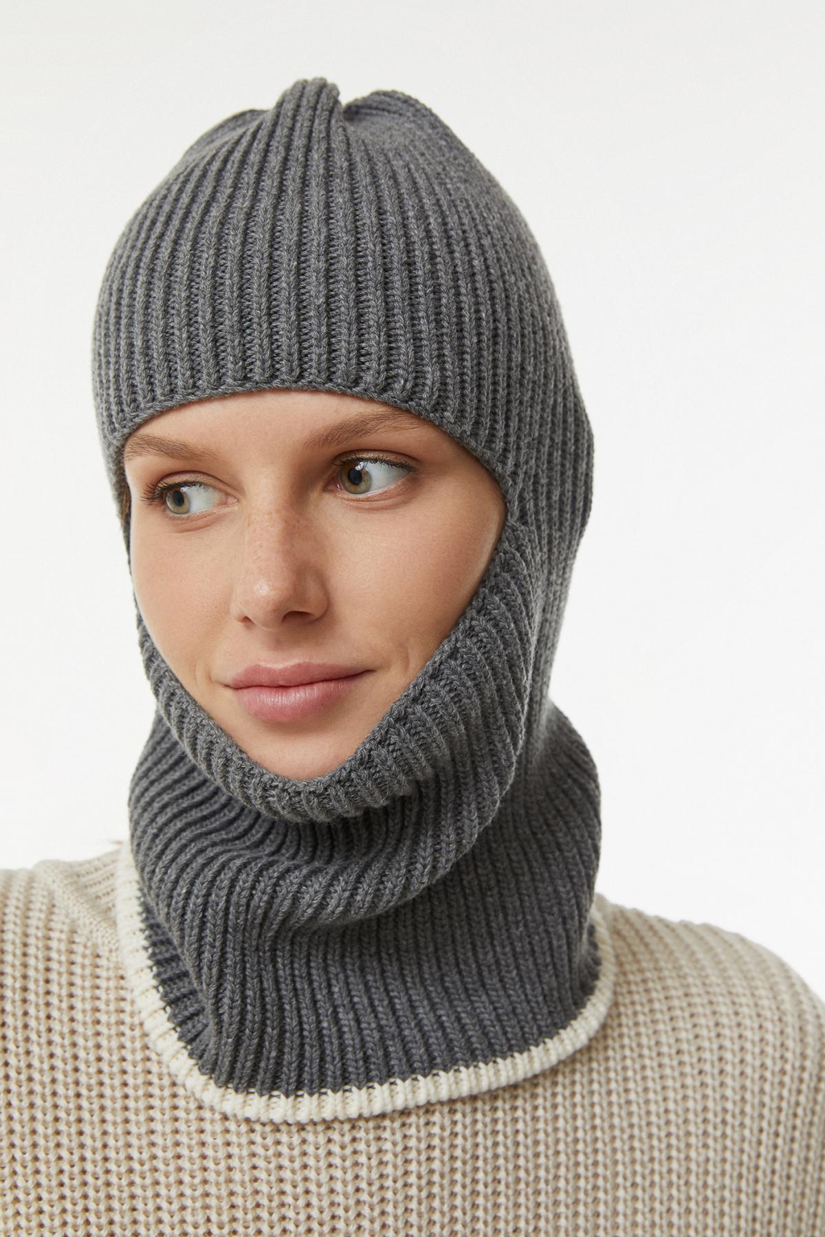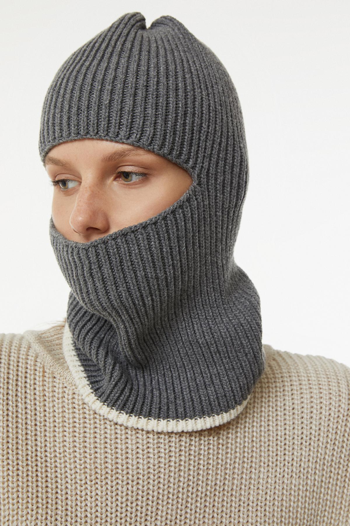 Шапка-шлем в нейтральном оттенке. Мелкая вязка с добавлением хлопка и кашемира, эластичный разрез, контрастная полоска по краю.