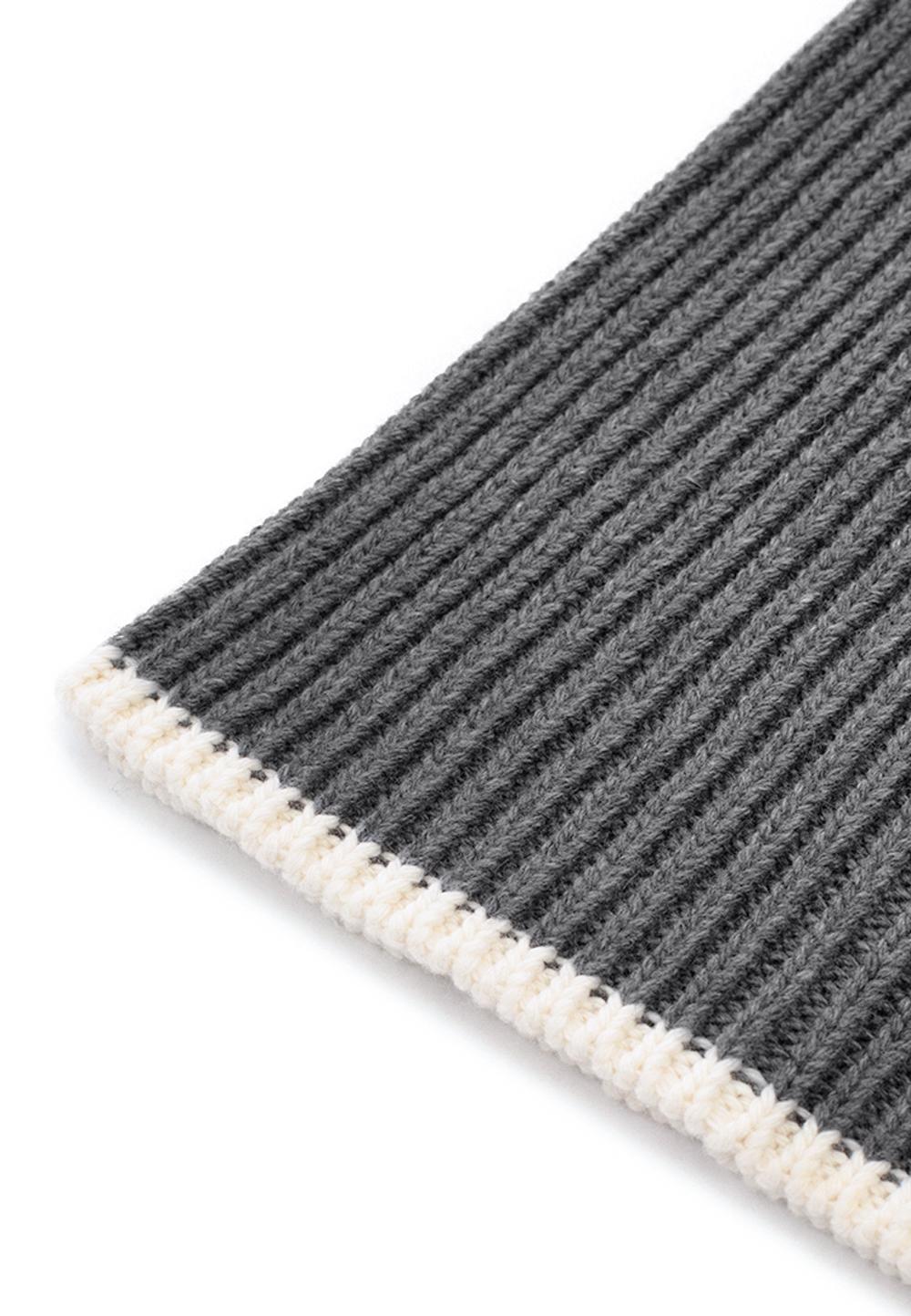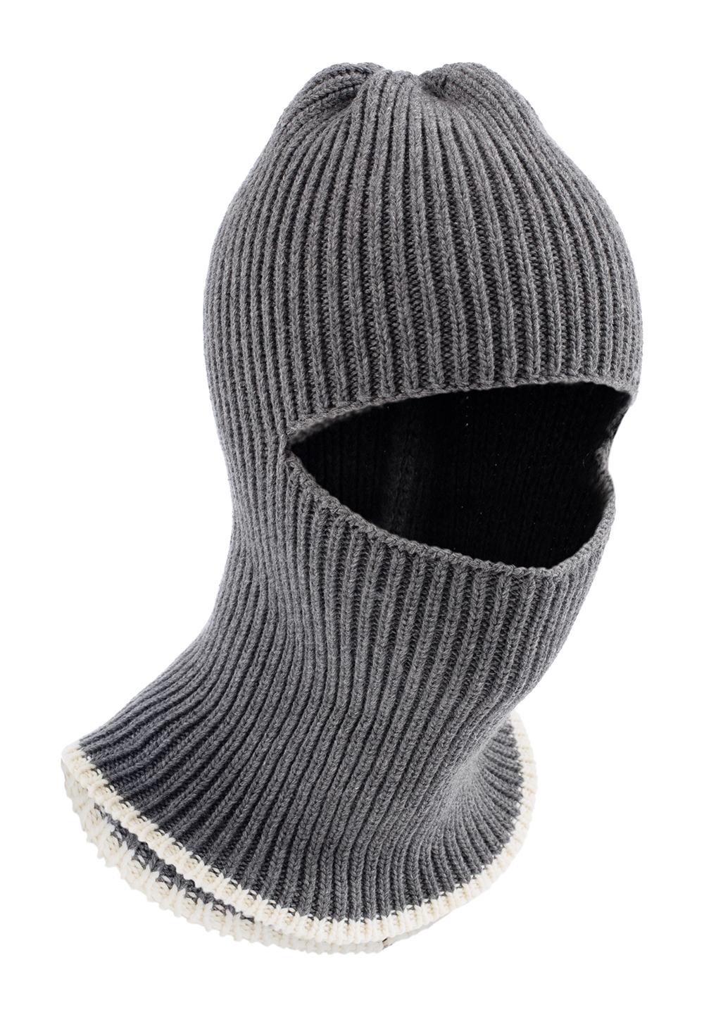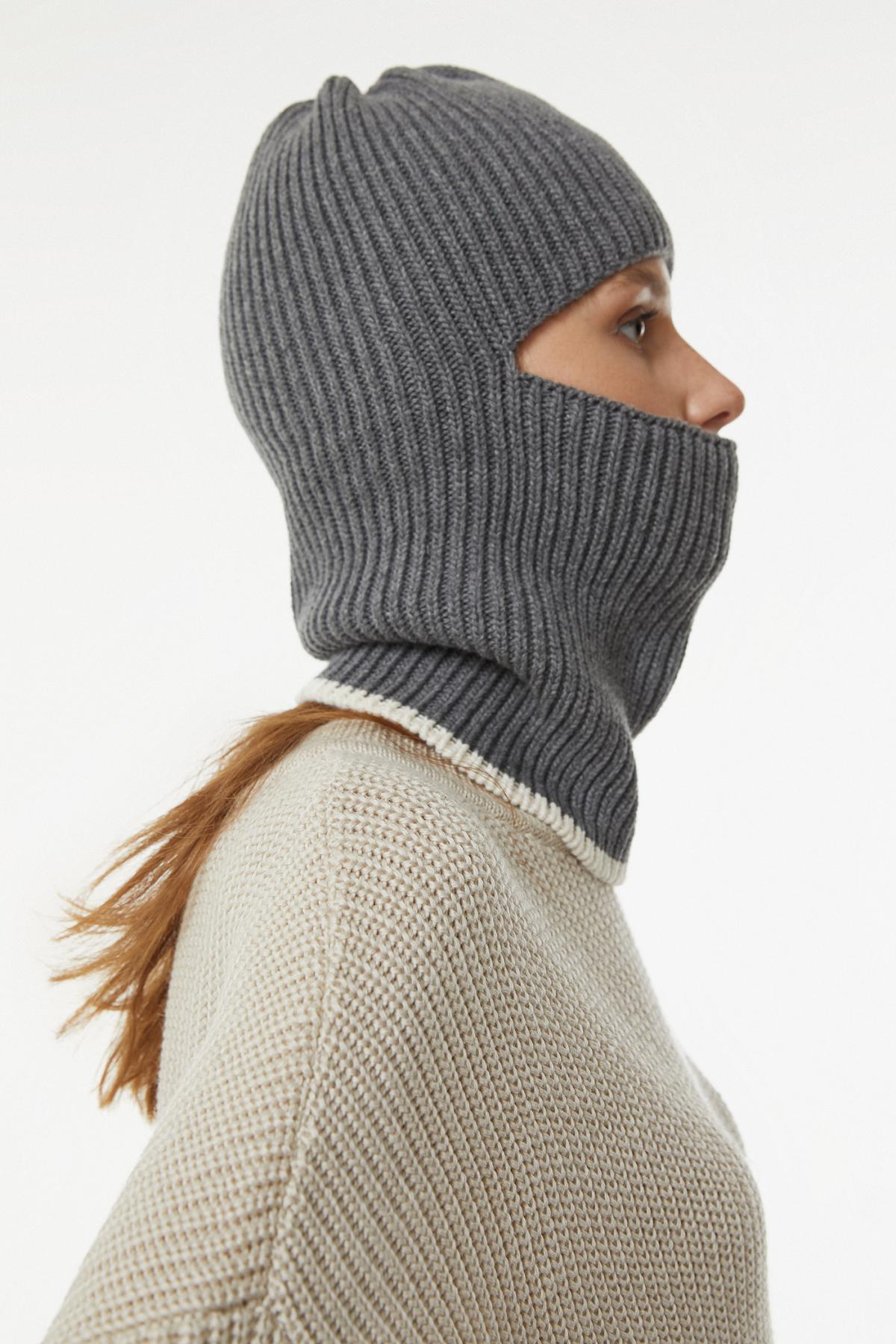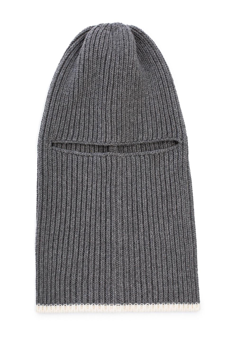 Шапка-шлем в нейтральном оттенке. Мелкая вязка с добавлением хлопка и кашемира, эластичный разрез, контрастная полоска по краю.