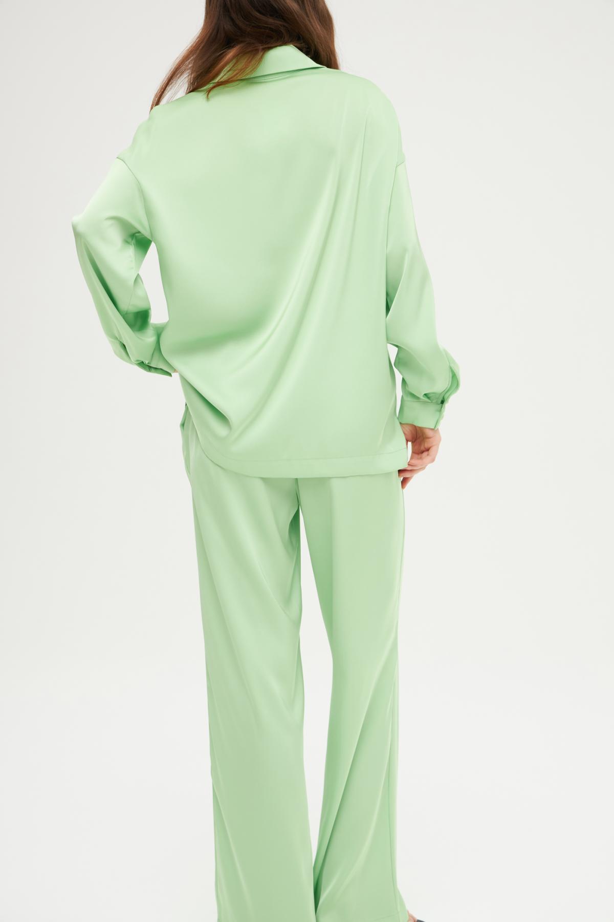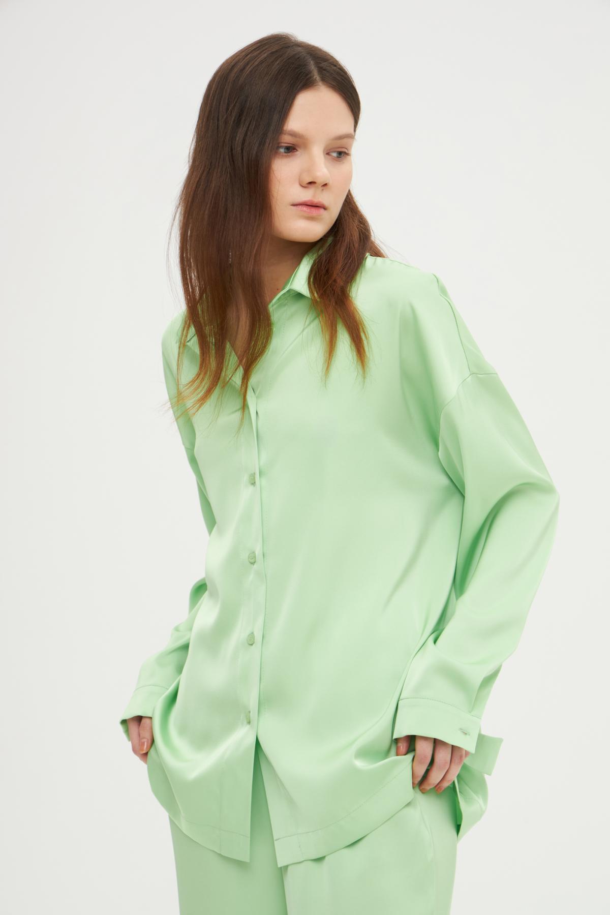 Однотонная блуза оверсайз кроя в пастельном оттенке. Спущенная линия плеча, треугольный вырез, отложной ворот, застежки-пуговицы.