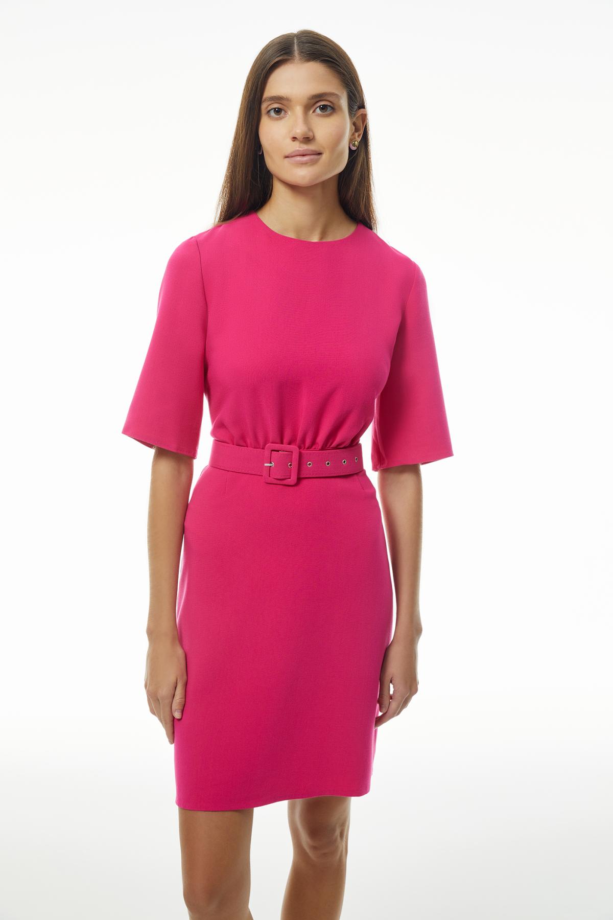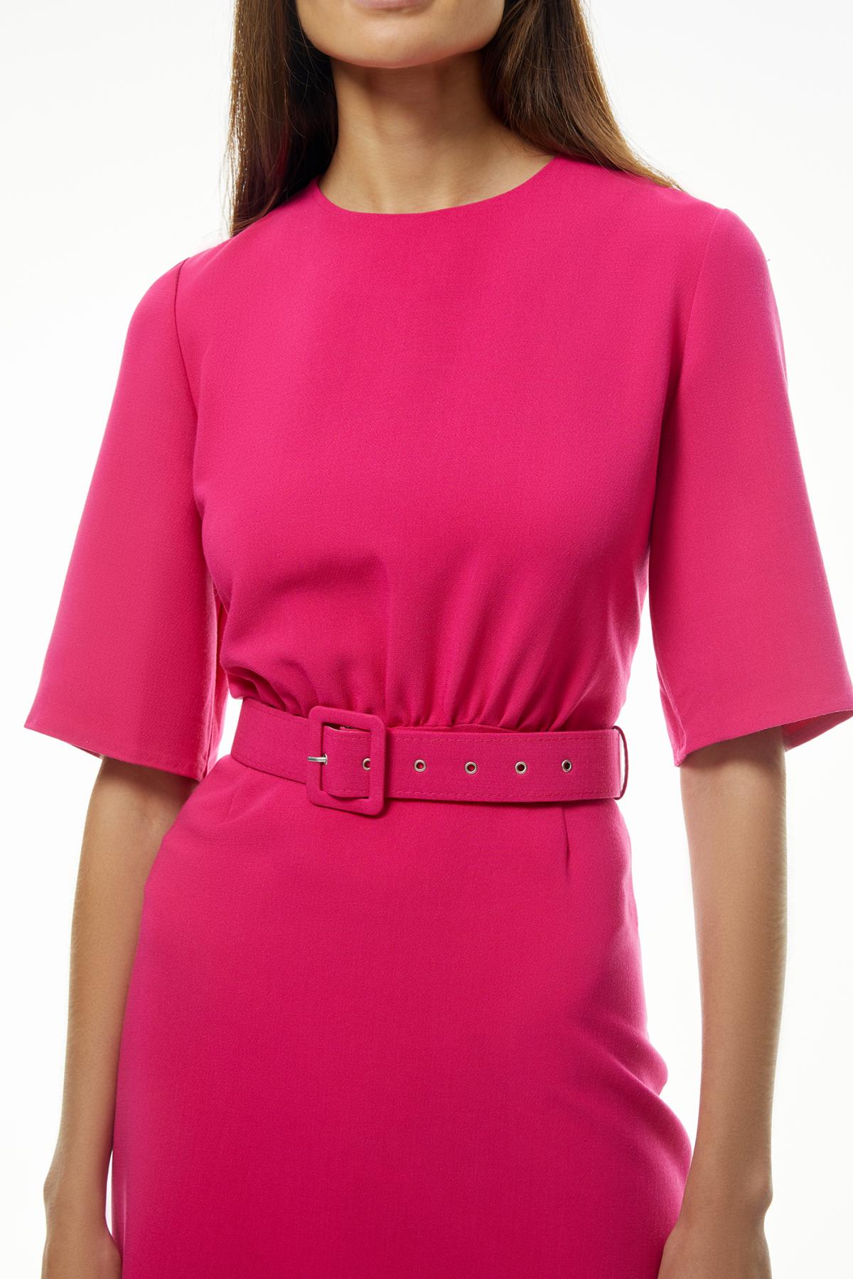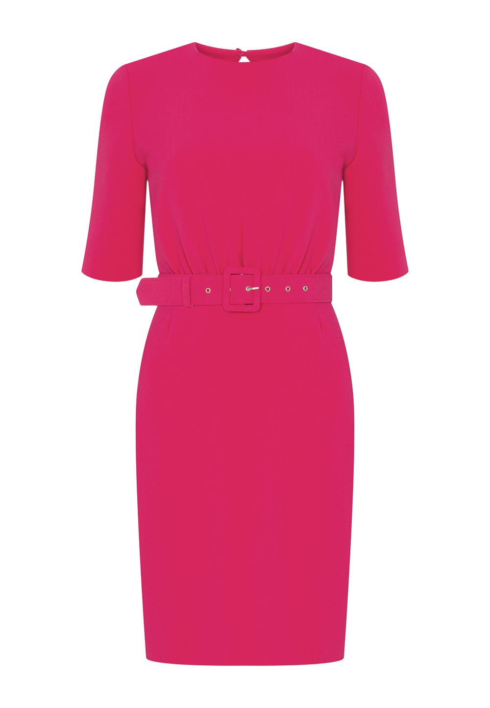 Платье-футляр приталенного силуэта в насыщенном оттенке. Длина мини, рукав три четверти, дополнено поясом в тон основной ткани.