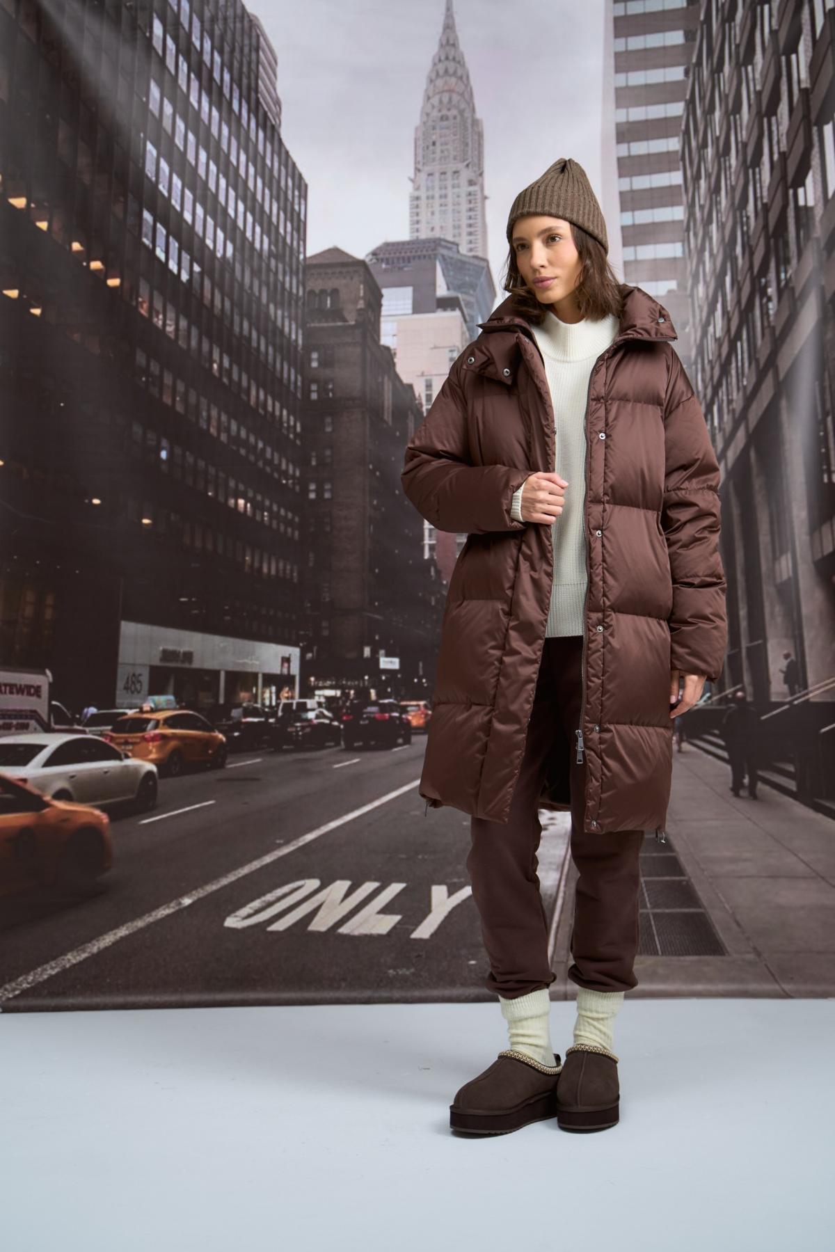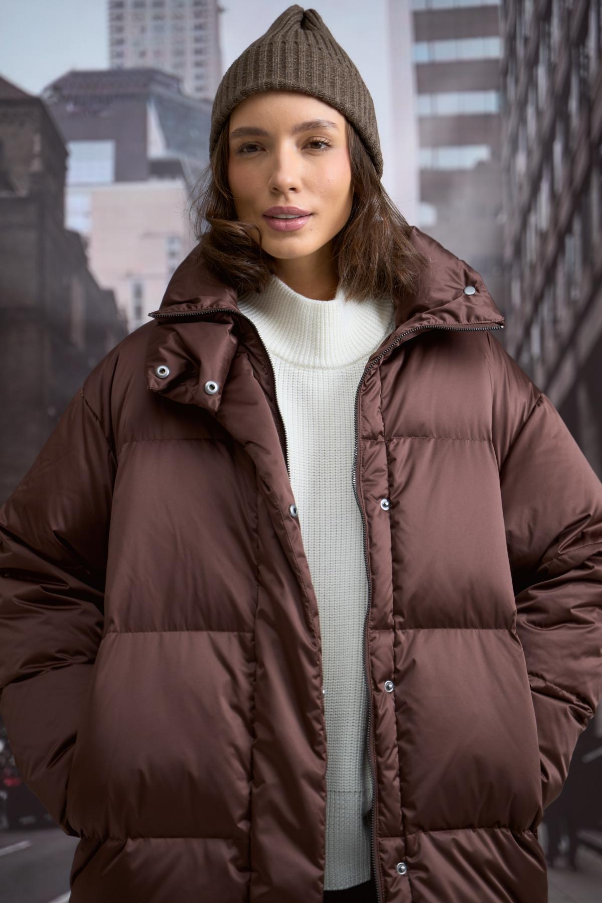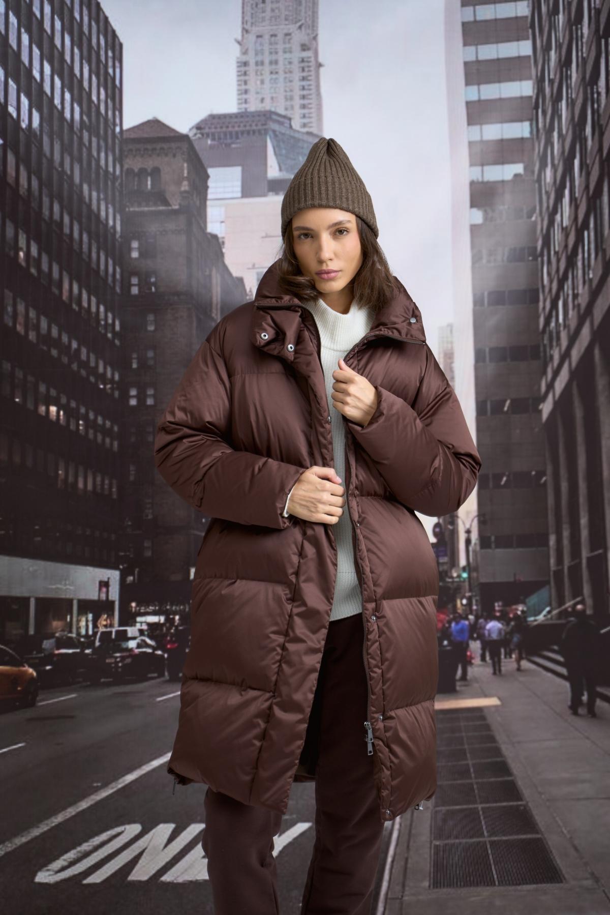 Удлинённых пуховик свободного кроя в шоколадном оттенке выполнен из прочной ткани, которая устойчива к ветру и отталкивает влагу. В качестве утеплителя модель имеет наполнитель из смеси пуха и