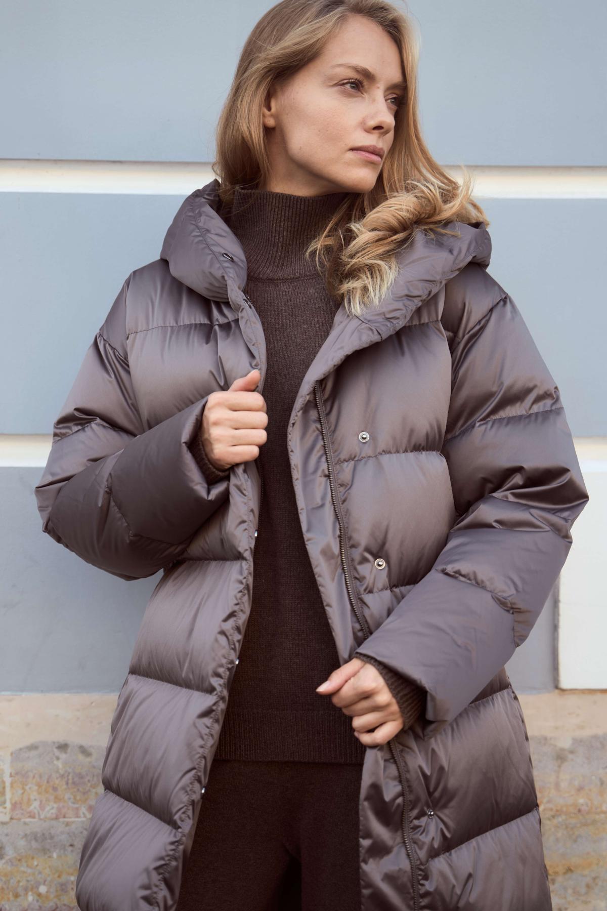 Легкий стильный пуховик ниже колена на молнии с капюшоном. Плотная ткань с деликатным блеском сатина, наполнитель: 80% пух, 20% перо. Подходит для температур до -20°C. Прямой силуэт, элегантный и практичный.
