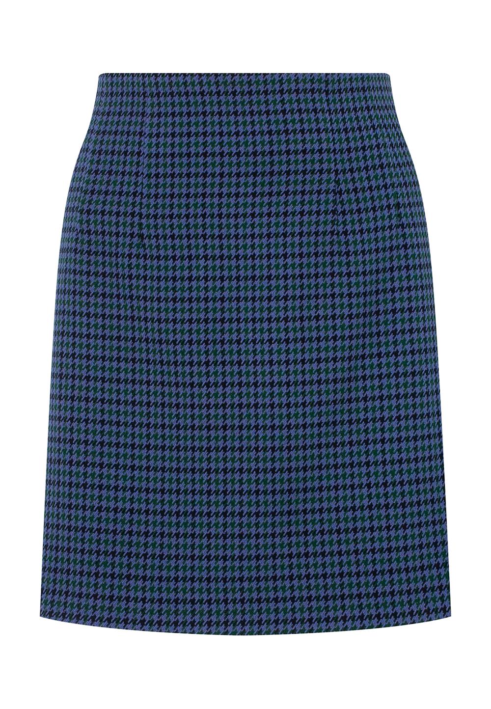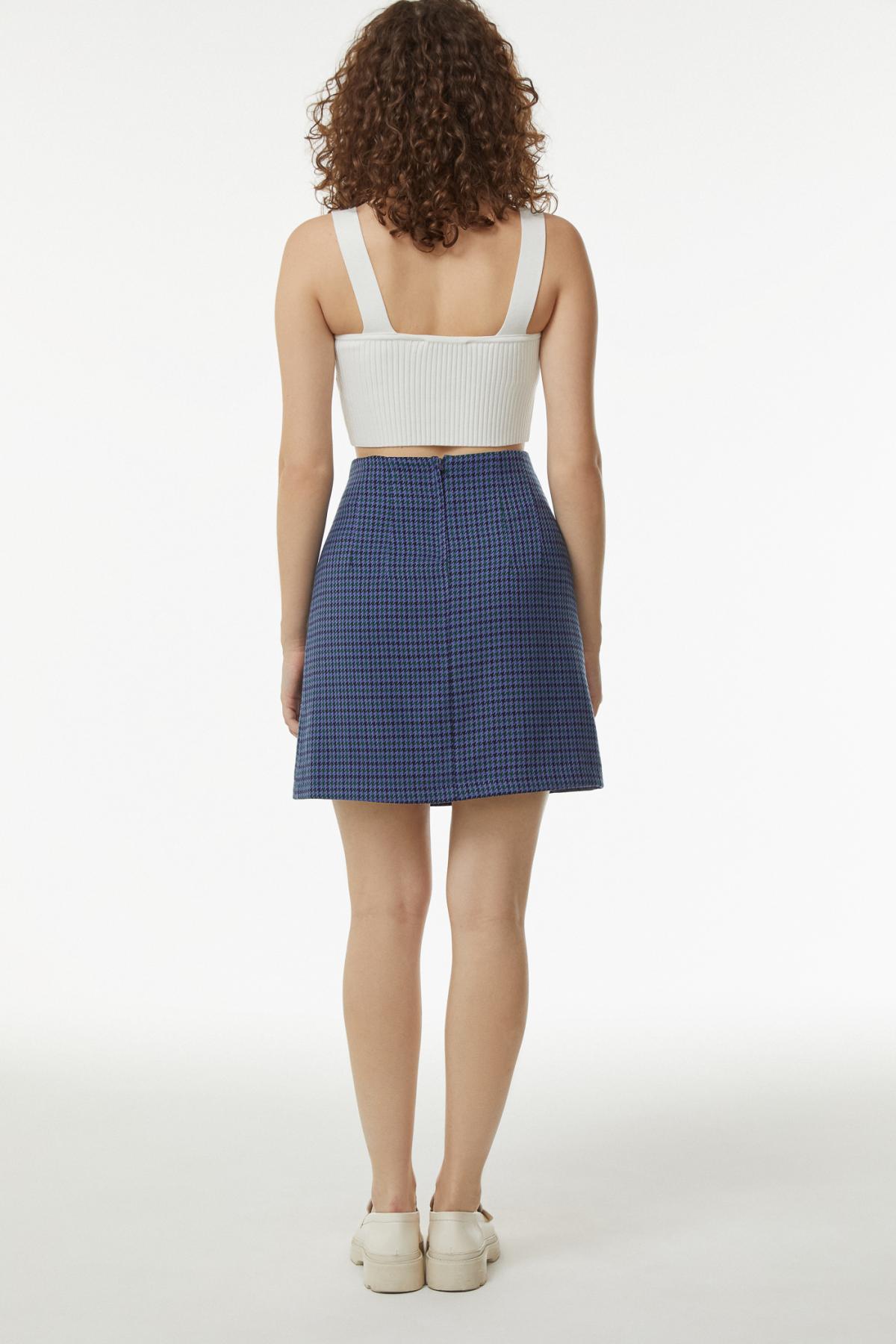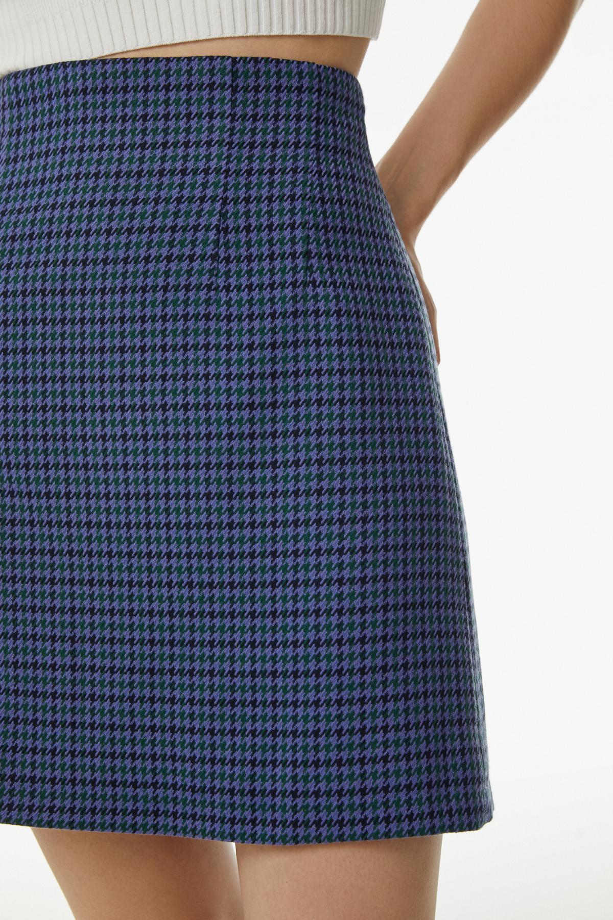 Юбка мини с высокой посадкой и принтом гусиная лапка. Застежка-молния, вытачки на талии, А-силуэт.