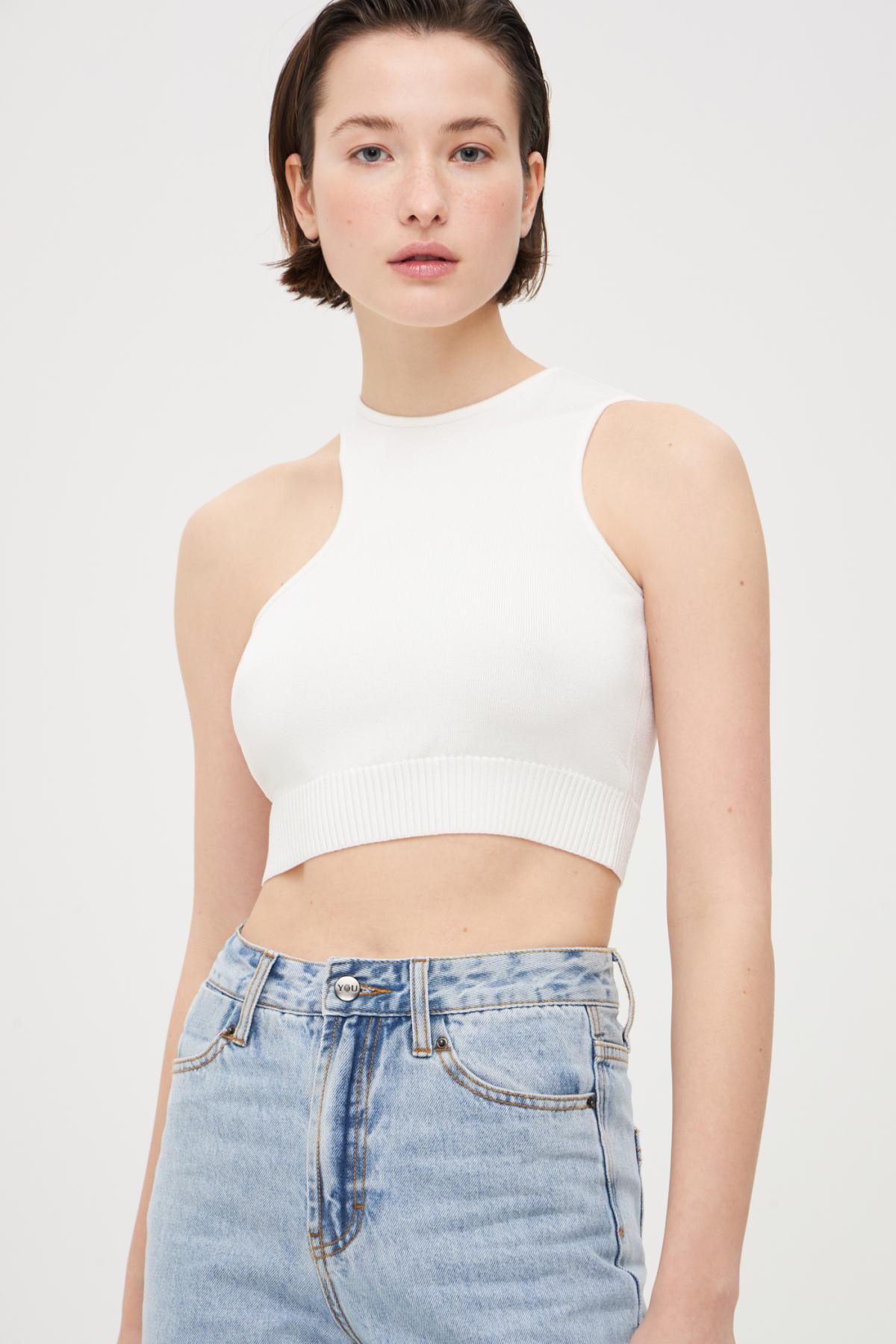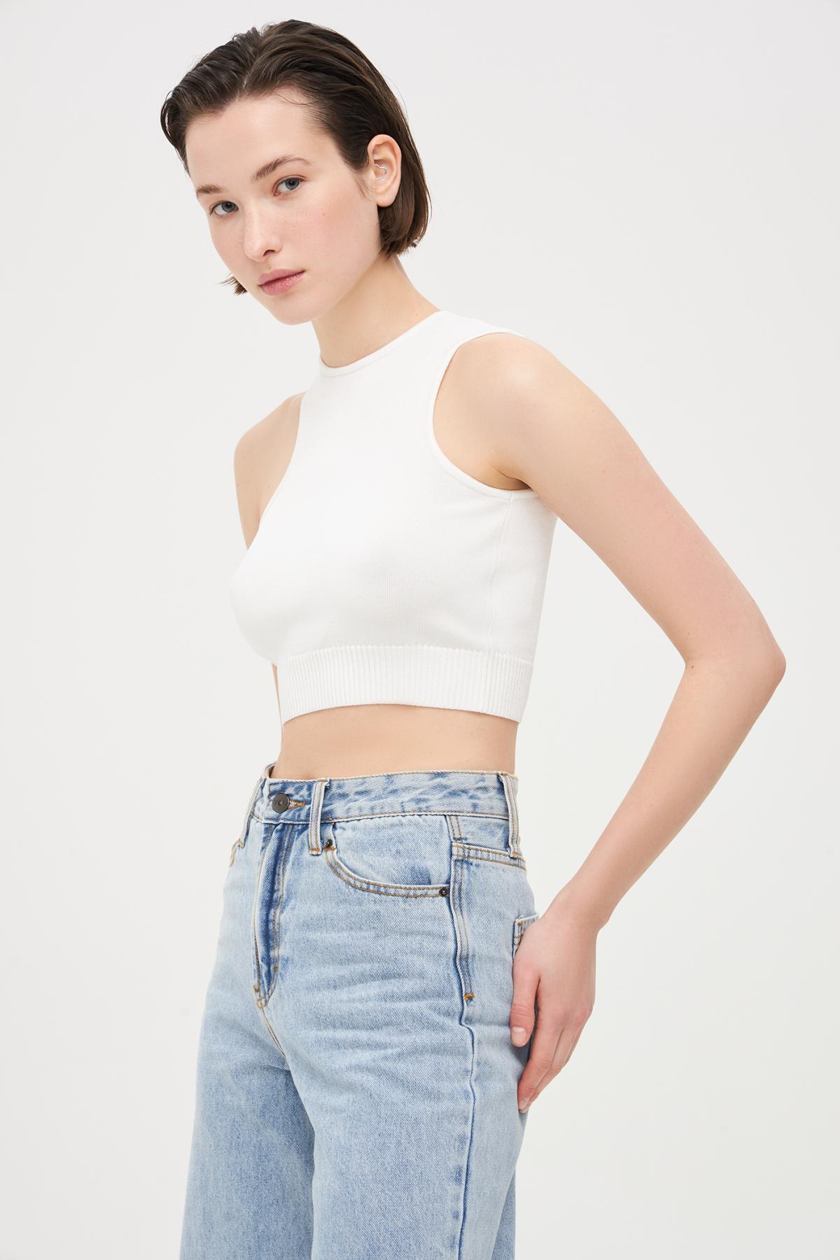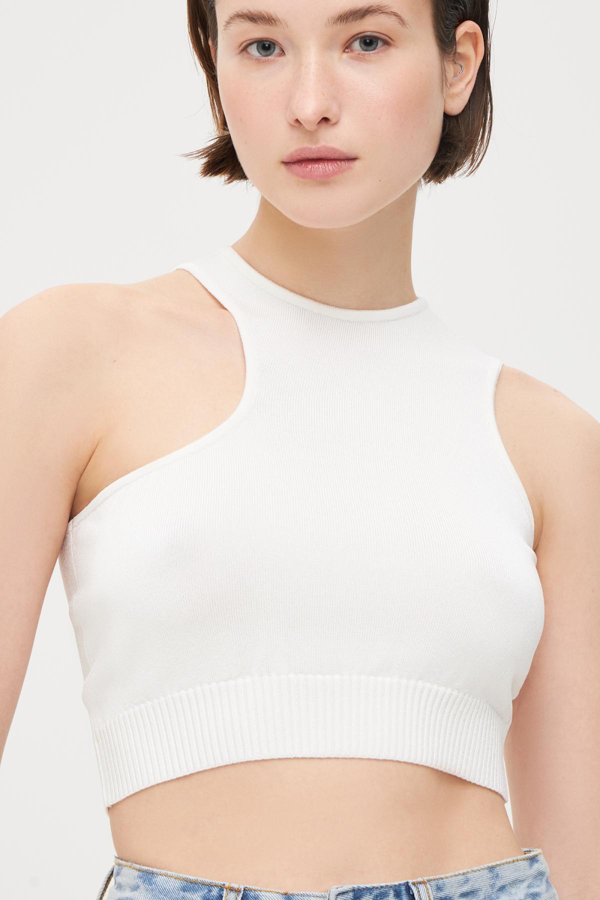 Асимметричный кроп-топ без рукавов мелкой вязки. Круглый вырез, прилегающий крой, эластичная резинка на талии.
