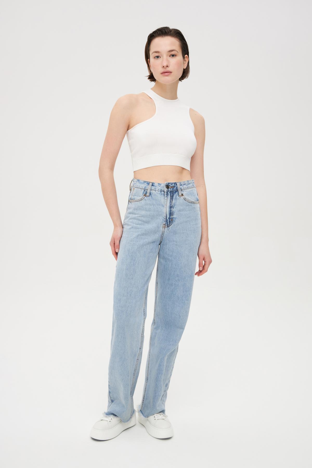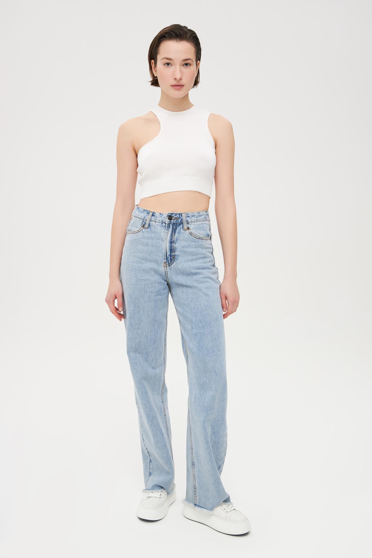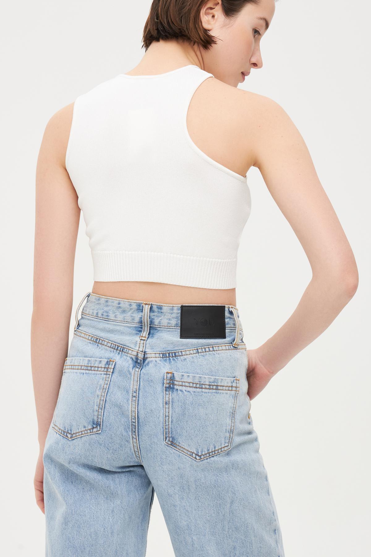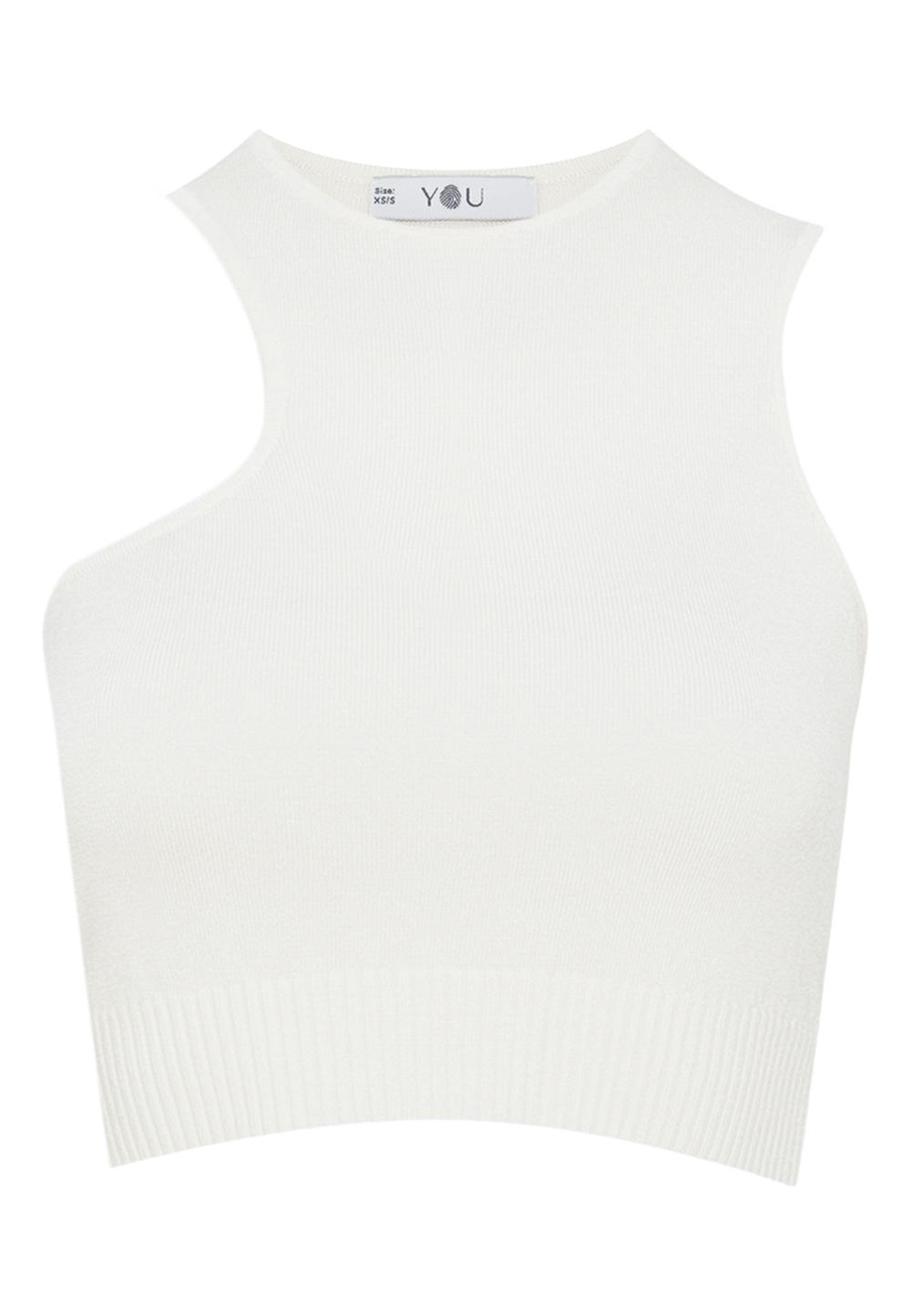 Асимметричный кроп-топ без рукавов мелкой вязки. Круглый вырез, прилегающий крой, эластичная резинка на талии.